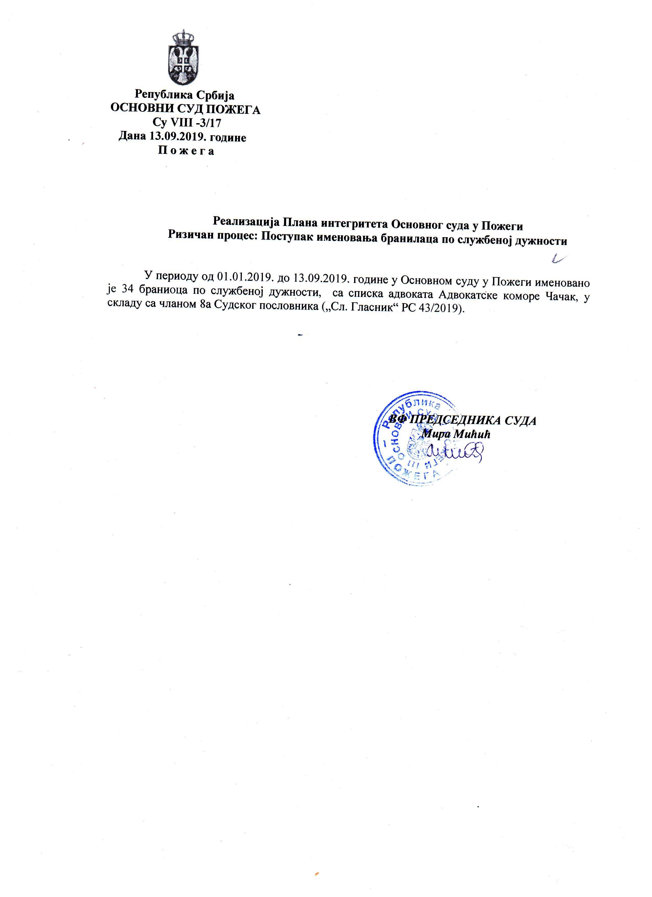 У периоду од 01.01.2019. до 13.09.2019. године у Основном суду у Пожеги именовано је 34 браниоца по службеној дужности, са списка адвоката Адвокатске коморе Чачак, у складу са чланом 8а Судског пословника ("Сл. Гласник" РС 43/2019).