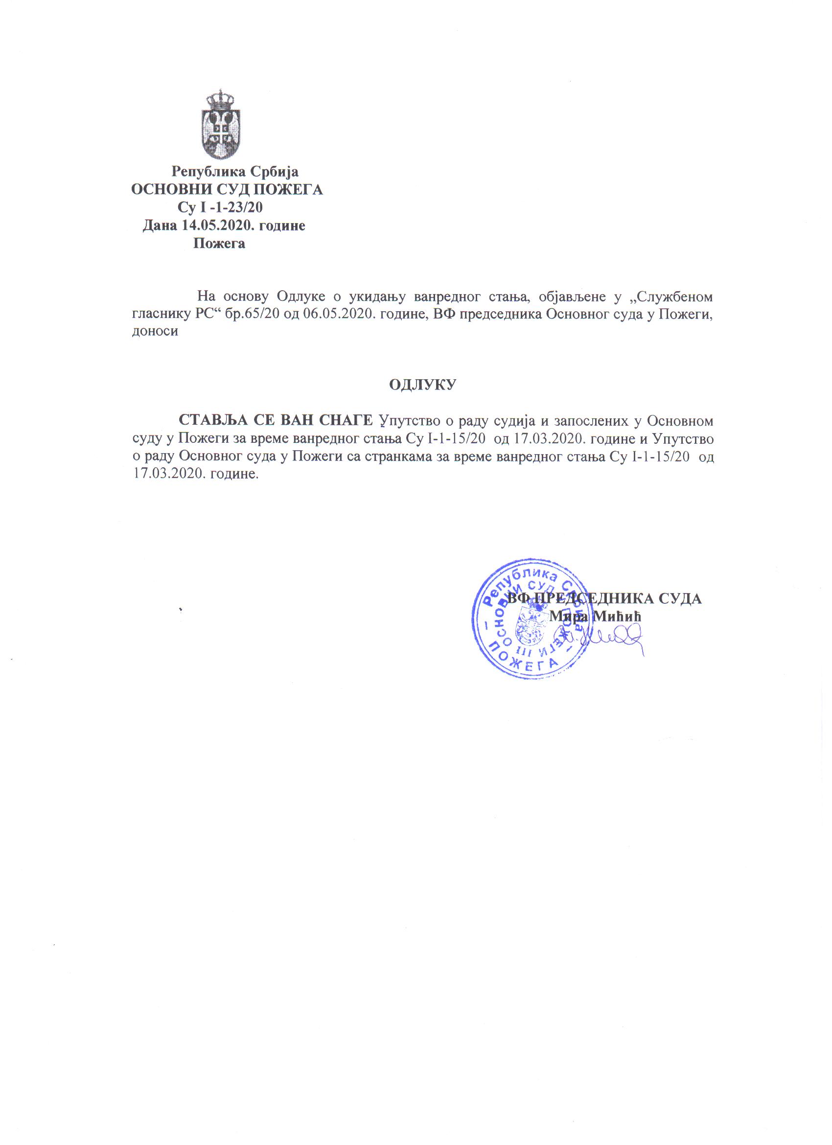 На основу Одлуке о укидању ванредног стања, објављене у "Службеном гласнику РС" бр.65/20 од 06.05.2020. године, ВФ председника Основног суда у Пожеги, доноси Одлуку СТАВЉА СЕ ВАН СНАГЕ Упутство о раду судија и запослених у Основном суду у Пожеги за време ванредног стања.